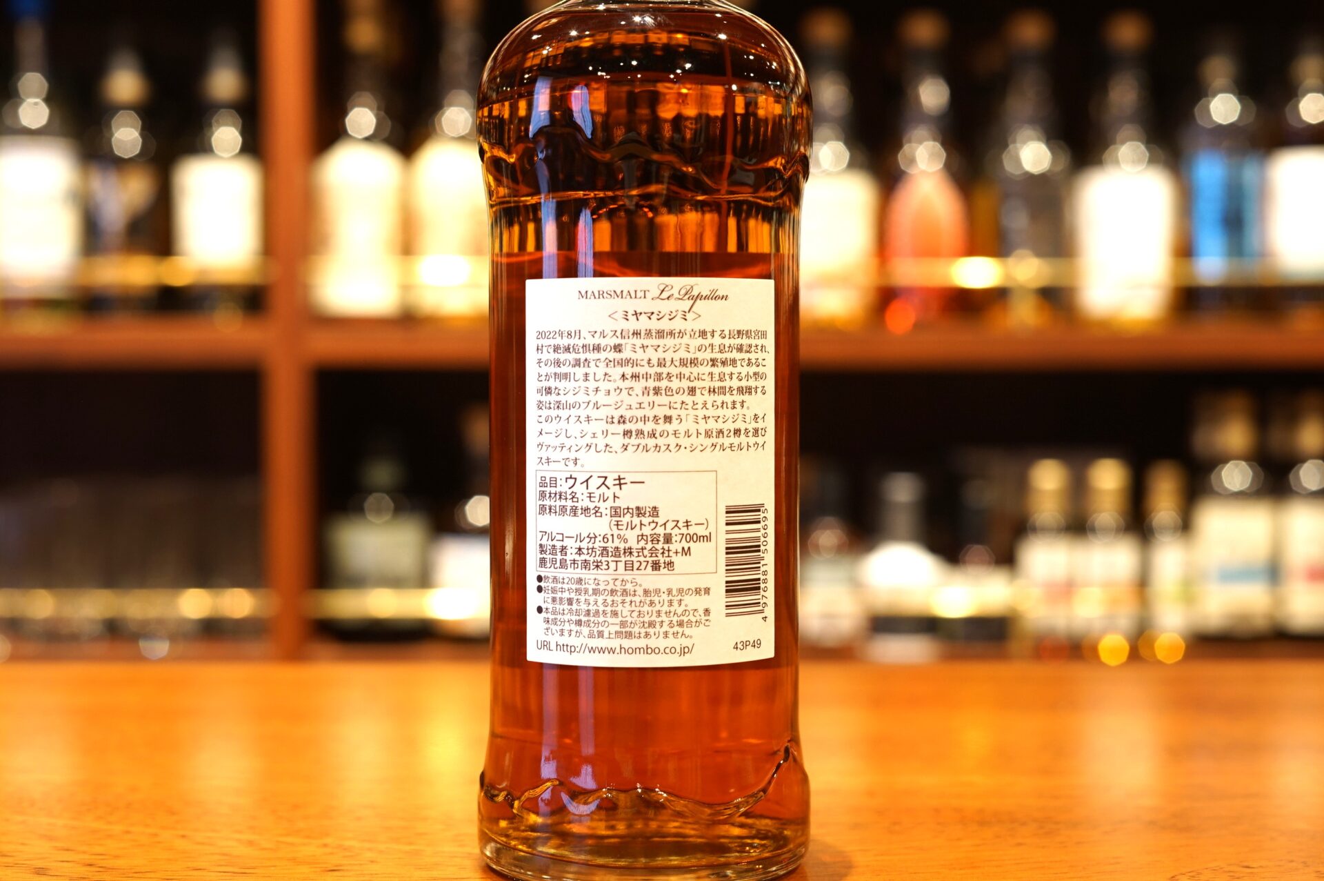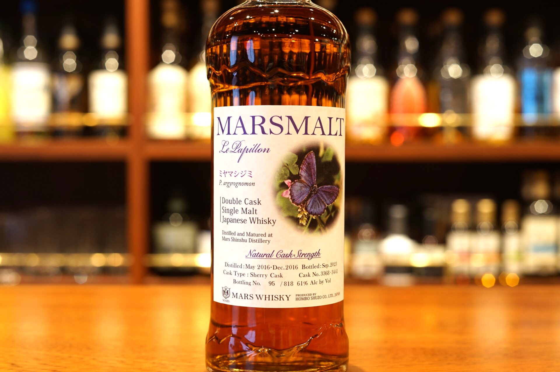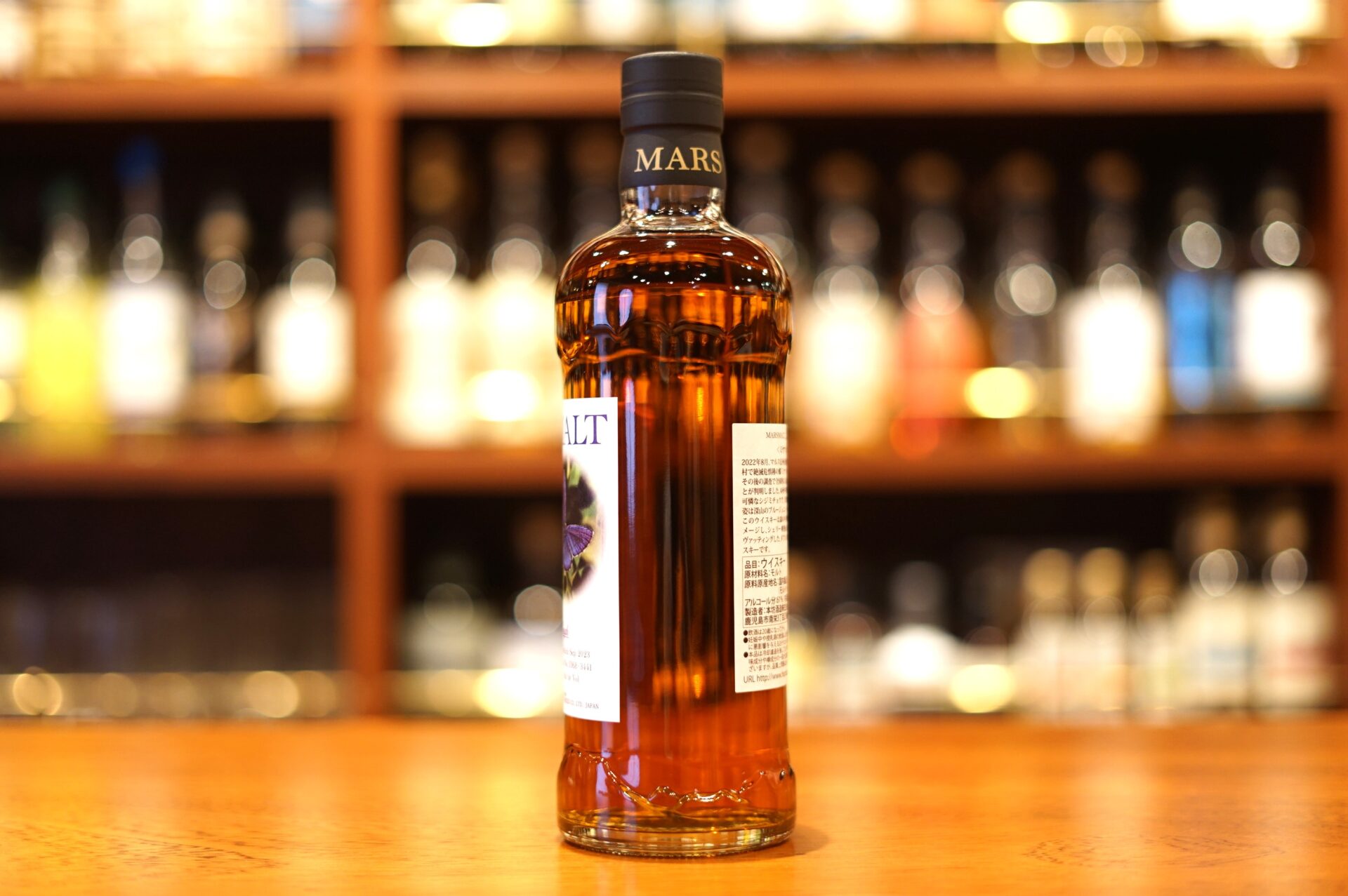 「2022年8月、マルス信州蒸溜所が立地する長野県宮田村で絶滅危惧種の蝶「ミヤマシジミ」の生息が確認され、その後の調査で全国的にも最大規模の繁殖地であることが判明しました。本州中部を中心に生息する小型の可憐なシジミチョウで、青紫色の翅で林間を飛翔する姿は深山のブルージュエリーにたとえられます。」このウイスキーは森の中を舞う「ミヤマシジミ」をイメージし、シェリー樽熟成のモルト原酒2樽を選びヴァッティングした、ダブルカスク・シングルモルトウイスキーです。